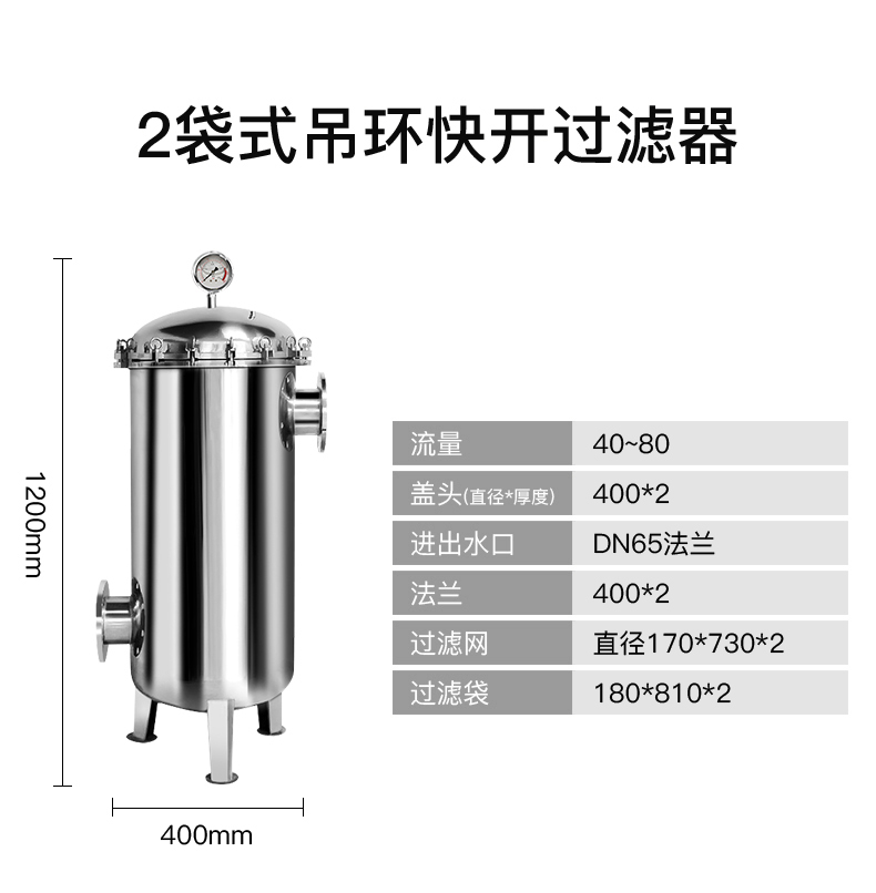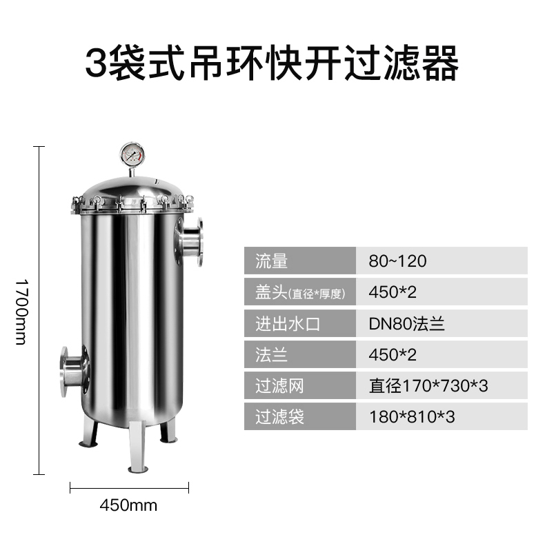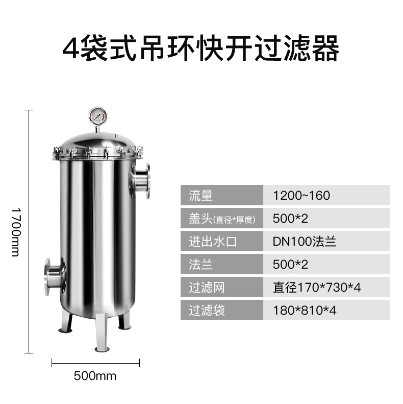標準多袋(dài)式過濾器,適用於大流量(liàng)過濾,可以容(róng)納更多雜質,也適用於希望使用較長時間後方才更換濾袋的場合。單機小流量50噸/小(xiǎo)時。日常維護(hù)非常便捷。